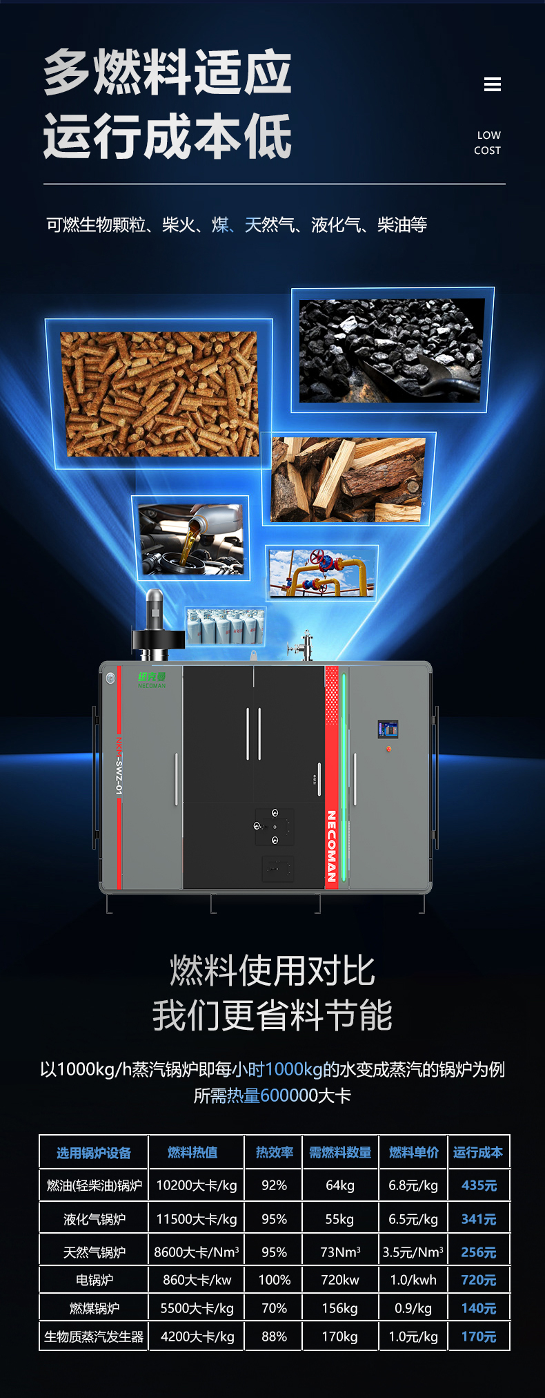 蒸汽量:6kg至6T;適用燃料:天然氣、油、生物顆粒;幾何容積<30L,免監檢;大爐門設計,可燃木塊等木質燃料,排煙溫度低、搭配多回程蛇形設計,壽命長,自主研發預制板結構,節省燃料;溫度、壓力、可定制,更多參數可致電15323300918...